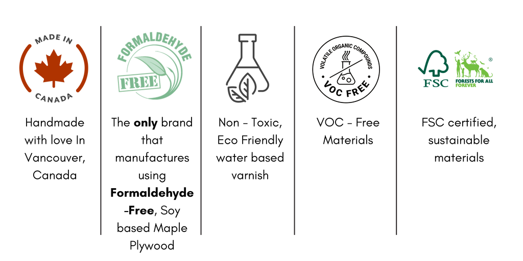 Crafted from maple plywood and birch plywood, chosen for their beauty, sturdiness, and eco-friendliness. These materials meet the strict California Air Resources Board (CARB) standards, ensuring they are safe for indoor air and environmentally responsible. This reflects our commitment to sustainability and delivering top-quality, safe products.