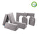 A set of seven gray modular foam pieces designed for creative play, with different shapes including arches and straight sections.